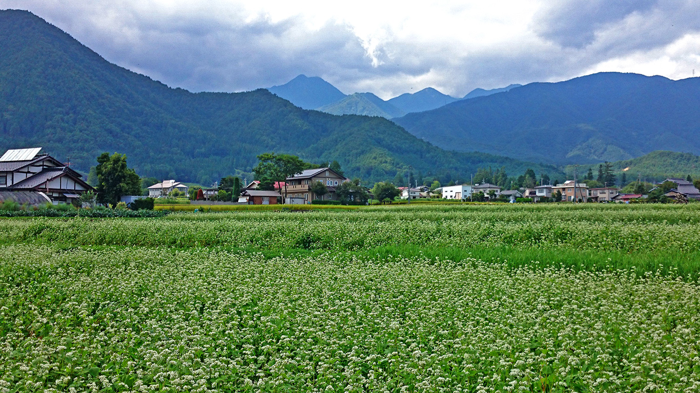 曽根原家住宅からみる有明山と常念岳と蕎麦の花